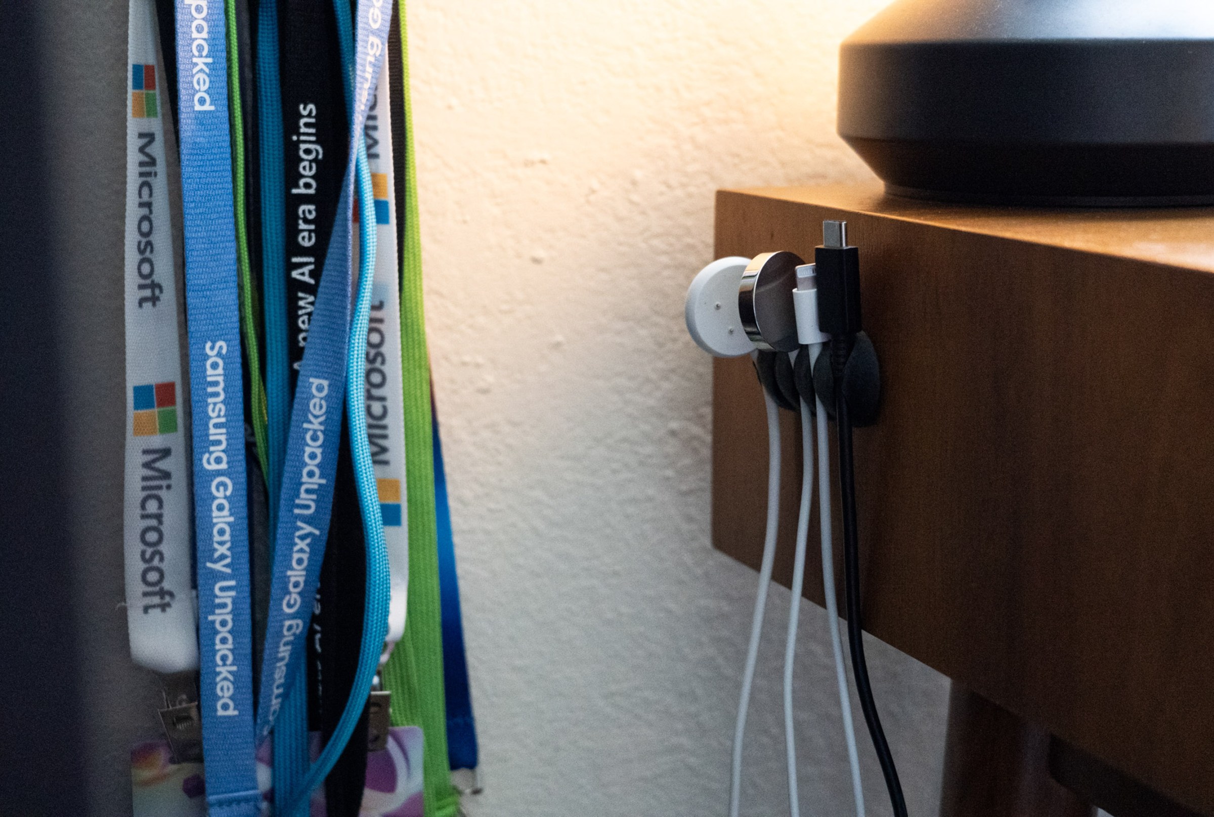 It wasn’t always this way! I need to have a few different kinds of chargers at the ready, since I switch smartwatches whenever I switch between Android and iOS, plus I’m never giving up my Lightning-charged iPhone 13 Mini. I used to fish the cables off the floor when I needed them but I finally got these stick-on cord holders, and I’ve been a changed woman ever since.