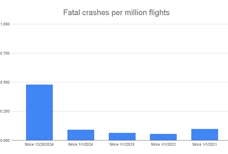 Over a longer time period, this spike in accidents doesn’t seem so alarming. Between January 2021 and November 2024, only three fatal commercial jet crashes occurred worldwide. The average risk of a fatal crash was 1 per 18 million flights. In 2021, however, there were seven fatal crashes around the world, bumping up the risk profile to 1 in 3.5 million flights, which is closer to the risk over the last two months: