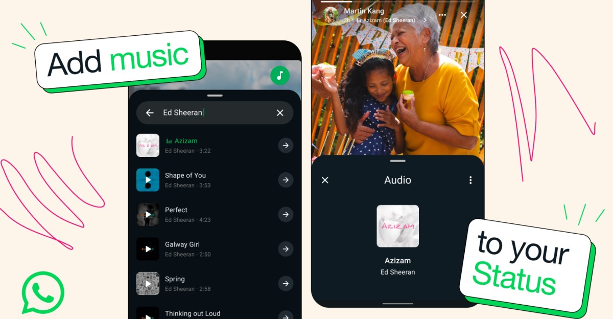 WhatsApp says that its music library has “millions of songs to choose from,” and that users can select the exact part of a track to add to their status — handy for zoning in on specific lyrics or soundbites for participating in viral trends. The in-status music update follows Meta adding similar capabilities to Instagram, and popularized previously by similar features found on defunct platforms like AIM and MySpace.