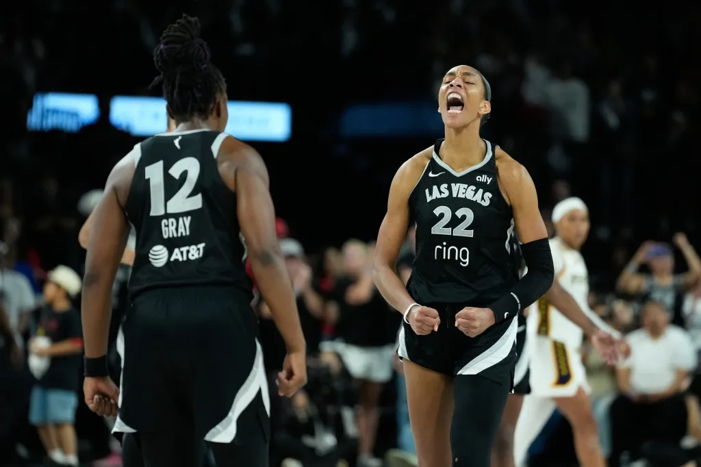 Las Vegas Aces center A’ja Wilson (22) and Las Vegas Aces guard Chelsea Gray (12) celebrate after a play against the Indiana Fever during overtime in Game 5 of a WNBA basketball playoff semifinals series Tuesday, Sept. 30, 2025, in Las Vegas. AP