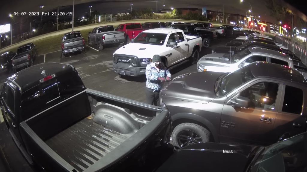 The RCMP released one minute and 23 seconds of surveillance footage on YouTube. It’s starts with a clip dated April 7, 2023, at around 9:20 p.m. and shows the unidentified woman keying at least four Ram pickup trucks.