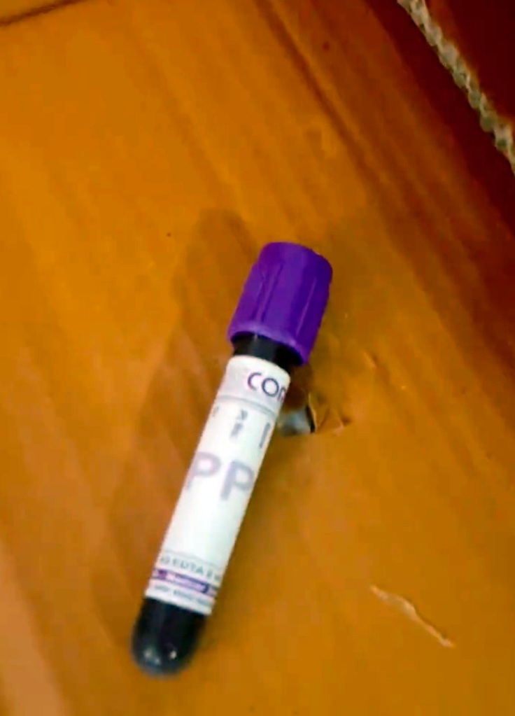 In the video posted online, Begakis films the cardboard box on the floor, showing bubble-wrapped chair pieces on the floor before displaying the single vial in the box, which appears to, indeed, be full of blood.