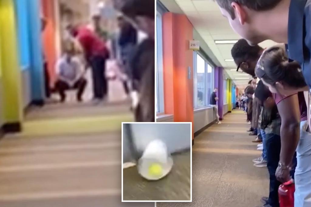 Video shows dozens of office employees all lined up against the wall of a narrow hallway.