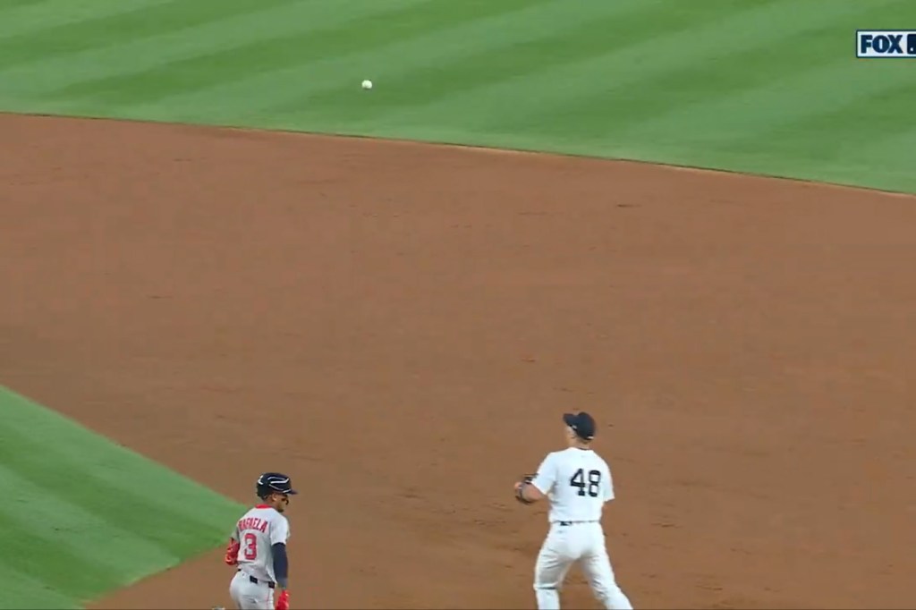 Jazz Chisholm Jr. committed one of the Yankees’ three errors during the second inning Aug. 21. Screengrab via X/@MLBONFOX