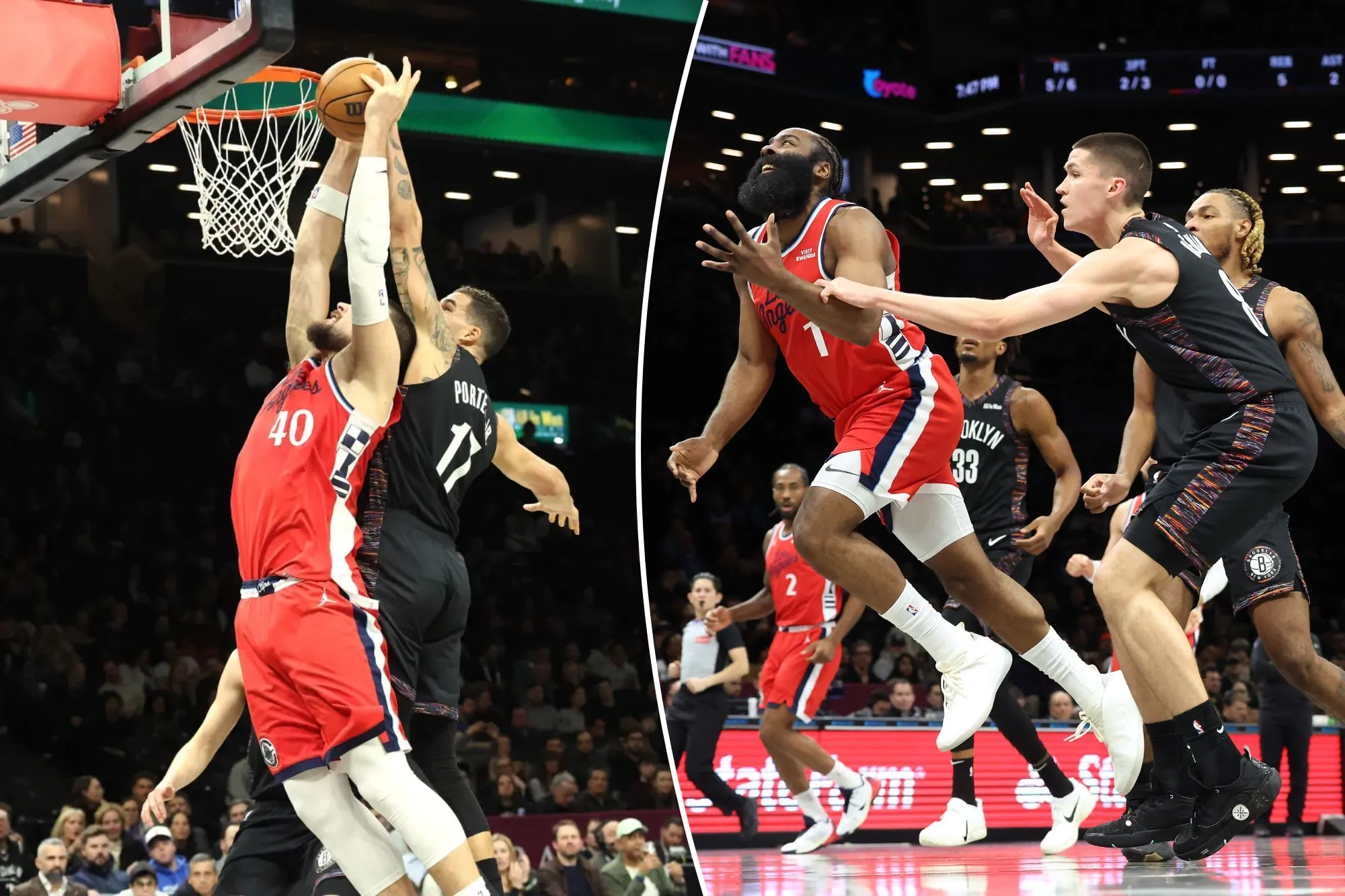 Egor Demin of the Brooklyn Nets fouls James Harden of the LA Clippers during the first quarter. Charles Wenzelberg/New York Post
