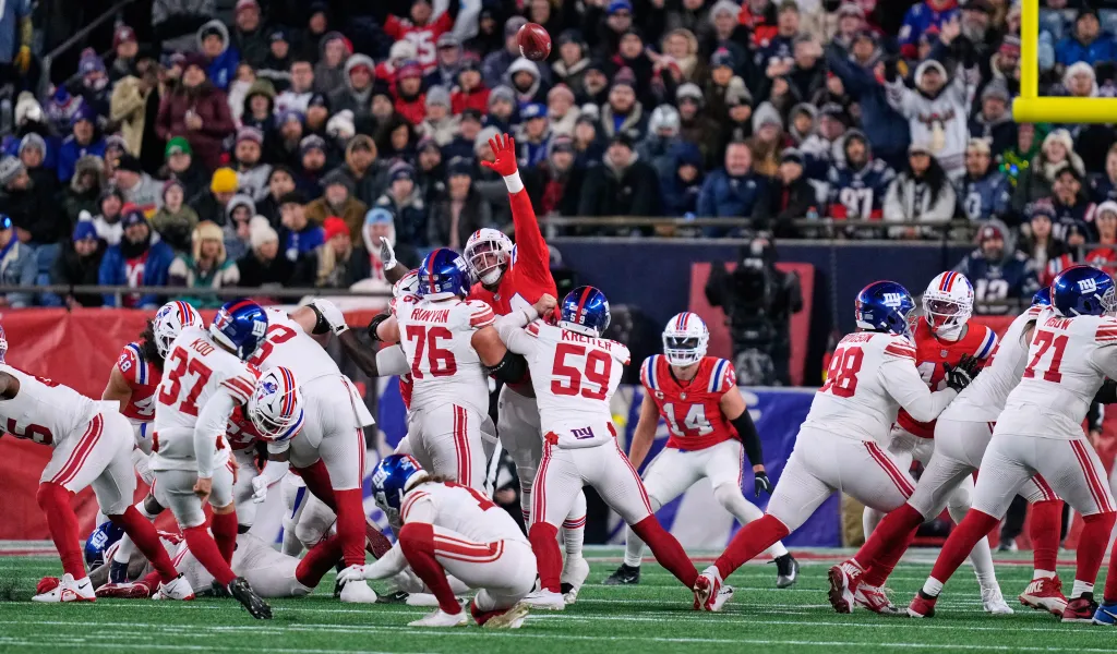Younghoe Koo attempts a kick during the Giants’ December 2025 game against the Patriots. AP